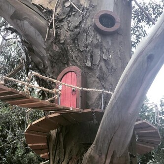 Lynn Kirkland from Herb World wanted a fairy village in The Herb Farm gardens so I linked between the trees little walkways, doors and windows for the kids to wonder over.